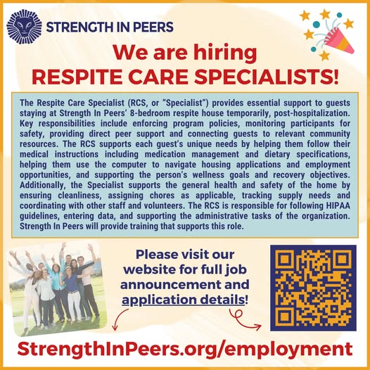 📣🧡📣 We are hiring! Strength In Peers is looking for kind, caring people to work part-time (16–30 hours/week) at our 8-bedroom medical respite home. We need people who can connect with others, inspire hope, and work well with people from all walks of life. You should be resourceful, proactive, and comfortable stepping in when someone needs support. Learn more and apply at: www.StrengthInPeers.org/employment (fb)