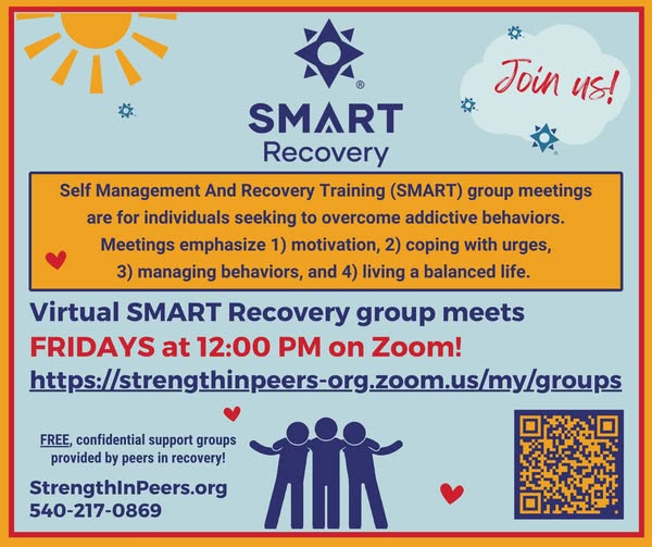 🧡 Take Charge of Your Recovery! Join Strength In Peers every Friday at 12 PM on Zoom for our SMART Recovery Group! ➡️ https://strengthinpeers-org.zoom.us/my/groups SMART Recovery is all about: 1️⃣ Finding your motivation 2️⃣ Learning how to beat urges 3️⃣ Managing tough behaviors 4️⃣ Building a balanced, happy life What is SMART Recovery? It’s a proven program that helps people overcome addictions and bad habits. SMART is stigma-free and puts you in control of your recovery. Want to meet in person? Come to our Harrisonburg group on Mondays at 3:30 PM 📍 917 N. Main St., Harrisonburg, VA 22802 Ready to start your journey? Join us this Friday! (fb)