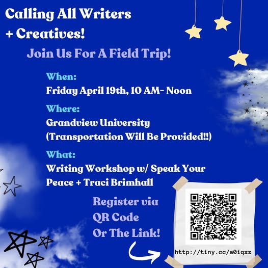 Calling All High School Writers! Today is the last day to snag a spot for our field trip to Grandview University on Friday April 19th. Transportation will be provided and you will be excused from class! Use the QR code or link below to grab your spot! Invite your friends too — all are welcome! (fb)