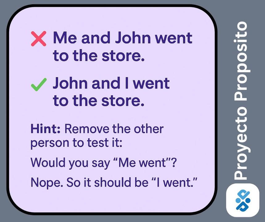 🌟 Pronombre de Sujeto vs. Pronombre de Objeto: "I" y "Me" 🌟 ¿Sabías que "I" y "me" se usan de manera diferente en una oración? ¡Te explicamos cuándo usar cada uno! 👇 🔹 "I" (Pronombre de sujeto) – Se usa cuando el pronombre es el sujeto de la oración, es decir, cuando realiza la acción del verbo. "I" siempre va antes del verbo. 👉 Ejemplo: John and I went to the park. (John y yo fuimos al parque.) 👉 En este caso, "I" realiza la acción de ir al parque. 🔹 "Me" (Pronombre de objeto) – Se usa cuando el pronombre es el objeto de la acción, es decir, cuando recibe la acción del verbo. "Me" siempre va después del verbo o de la preposición. 👉 Ejemplo: John gave me a gift. (John me dio un regalo.) 👉 Aquí, "me" es quien recibe la acción de ser dado el regalo. En resumen: "I" = pronombre de sujeto, va antes del verbo (quien realiza la acción). "Me" = pronombre de objeto, va después del verbo (quien recibe la acción). 🎯 Consejo: Si el pronombre está haciendo algo, usa "I" antes del verbo. Si está recibiendo la acción, usa "me" después del verbo. (fb)