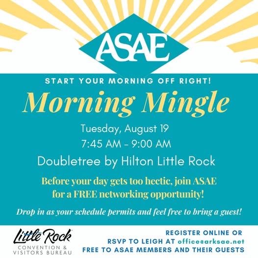 Join us for the ASAE MORNING MINGLE - A Free Networking Event for Members and Guests Tuesday, August 19 7:45 AM - 9 AM Doubletree by Hilton Little Rock This event is FREE for ASAE Members and Potential Members. Learn more here: https://arksae.memberclicks.net/monthly-events Sponsored by Premier Partner Little Rock, Arkansas CVB. (fb)