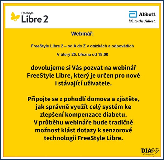 ✅ ABBOTT WEBINÁŘ PRO PACIENTY Dovolujeme si Vás pozvat na webinář FreeStyle Libre, který je určen pro nové i stávající uživatele. Připojte se z pohodlí domova a zjistěte, jak správně využít celý systém ke zlepšení kompenzace diabetu. V průběhu webináře bude tradičně možnost klást dotazy k senzorové technologii FreeStyle Libre. Těšíme se na každého z Vás a doufáme, že veškeré informace budou pro Vás přínosem. Webinář: FreeStyle Libre 2 – od A do Z v otázkách a odpovědích V úterý 25. března od 18:00 ❤️ Přihlásit se na webinář můžete kliknutím: https://1url.cz/@freestyle22 #diakar #abbott #freestylelibre (fb)