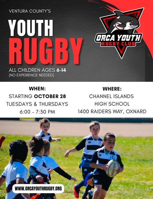 🏉 Youth Rugby is Back in Ventura County! No experience needed — just bring your energy and curiosity! For kids ages 6–14, Orca Youth Rugby Club offers a fun, inclusive way to build confidence, teamwork, and athletic skill. Boys and girls play together and learn the game from certified coaches in a supportive environment. 📅 Starting October 28 🕕 Tuesdays & Thursdays, 6:00–7:30 PM 📍 Channel Islands High School — 1400 Raiders Way, Oxnard 👉 Register or learn more at www.orcayouthrugby.org (fb)