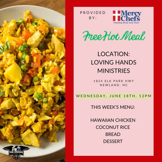 FREE HOT MEAL-- Wednesday, June 18th LOCATION: Loving Hands Ministry 1824 Elk Park Hwy, Newland, NC First come, first served until its gone!! We are providing a free hot meal on Wednesday, June 18th starting at 12pm provided by Mercy Chefs. We cannot wait to see you there. (fb)