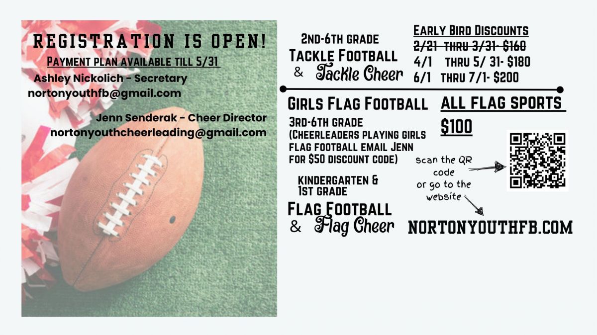 Home of The Norton Youth Panthers IN PERSON REGISTRATION March 21 67pm Norton Primarydon39t miss theearly bird discount. April 15 67pmNorton Primary May 31 122pm Columbia Woodslast day for discount June 30 78pm Columbia Woods hurry. Don39t miss out on football season. Sign up today.