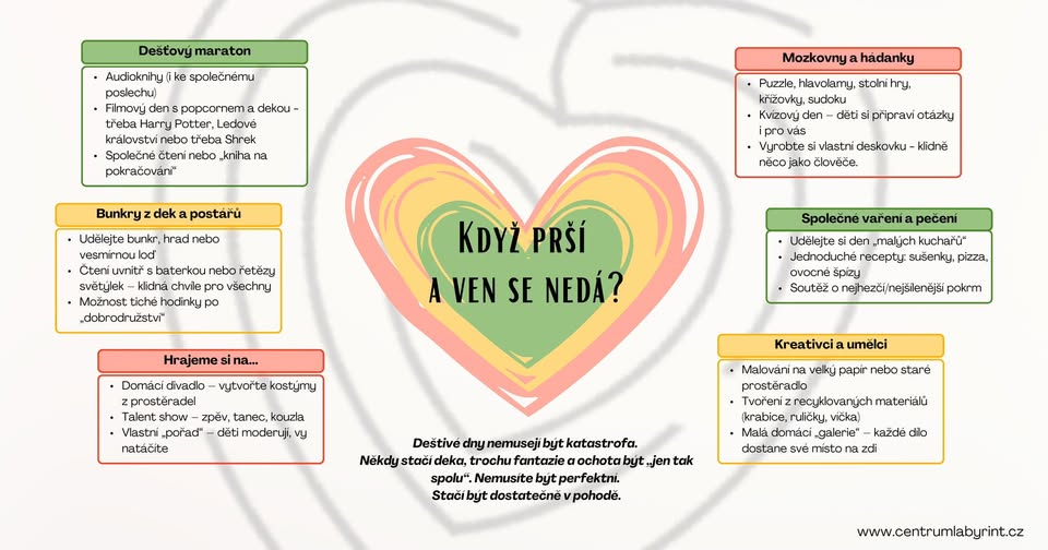 ☔️ Prší, ven to nejde a děti už lezou po stropě? Nejste v tom sami – a i z deštivého dne může být prima dobrodružství! 💛 Připravili jsme pro vás 7 nápadů, jak přežít déšť v klidu a s úsměvem – bez složité přípravy a bez stresu: 🎬 Filmový maraton s dekou a popcornem 🛏 Stavění bunkrů z dek 🎭 Domácí divadlo nebo „talent show“ 🧩 Mozkovny a tvoření vlastních her 🍪 Společné vaření a pečení 🎨 Výtvarné tvoření i domácí galerie 📚 Čtení, audioknihy, kniha na pokračování... 👉 Děti nepotřebují dokonalost – potřebují vás. Někdy stačí jen být spolu. I obyčejný gaučový den může být ten, na který budou vzpomínat. 📎 Uložte si infografiku nebo ji sdílejte dál – může se hodit komukoliv, kdo má doma malý chaos s velkým srdcem. #centrumlabyrint #destivyden #vycerpanyrodic (fb)