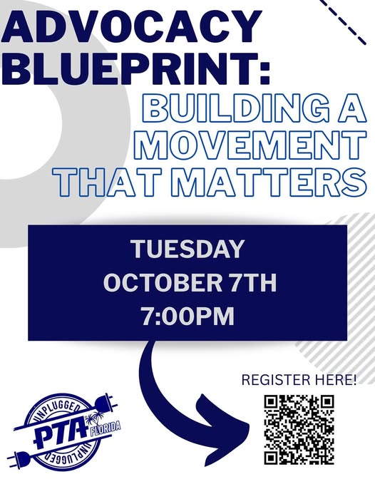 Florida PTA’s Leadership Development Committee presents - Advocacy Blueprint: Building a Movement that Matters. This workshop is geared to empower parents, educators, and advocates with the tools, training, and mentorship to lead with purpose and drive lasting change. Join us on October 4th from 12:00-1:30pm for Part 1, register here: https://us02web.zoom.us/meeting/register/7rivUkXOTtiQ56qpgl6F2w (fb)