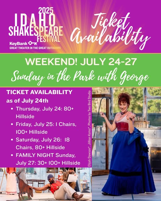 🎟️ We can’t believe it either… but there are still reserved seats available this Friday, Saturday, and Sunday for SUNDAY IN THE PARK WITH GEORGE! Audiences are raving: “Opening night was amazing! Great cast, costumes, stage, music… all wonderful!” – Betsy, via Facebook Don’t miss your chance to see this gorgeous, moving show under the stars. Get your seats before they vanish! 🎨 Tickets: https://idahoshakespeare.org/calendar/ (fb)