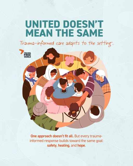 “United” doesn’t mean “the same.” Trauma-informed care isn’t a one-size-fits-all method — it adapts to meet unique needs in every setting. 🏫 In schools, it looks like safe routines. 👩⚕️ In healthcare, it looks like compassion and patience. 🏘️ In communities, it looks like safe spaces and support. Different approaches. Shared purpose. Together, we’re building a trauma-informed world. 💛 #TraumaInformedCare #Education #United #Diversity #CommunityBuilding #Diverse #TraumaTraining #Healing #MentalHealth #TraumaFreeWorld #Psychology #Community #ChildhoodTrauma #Nonprofit #Charity #ProfessionalDevelopment #Safety #Childhood #Trauma (fb)