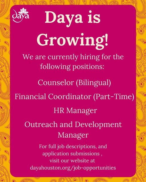 Daya is growing! We are hiring for four positions currently. Daya is proud to have a dynamic team helping survivors of domestic violence and stopping the cycle of abuse. Join our team and be part of the movement. Visit dayahouston.org/job-opportunities to see the full job descriptions and apply now! (fb)