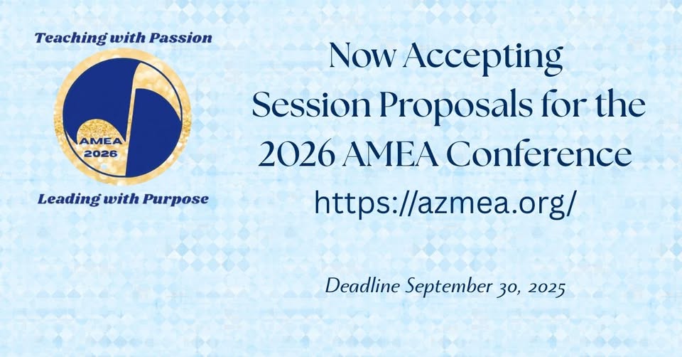 🎶 Planning is underway for the 2026 AMEA Conference! We’re excited for this year's event —and we’d love you to be part of it. 🎤 Session Proposals are now open! 🗓️ New Deadline: September 30 Don't miss your chance to contribute to Arizona’s premier music education event! 👉 Submit your proposal today! (fb)