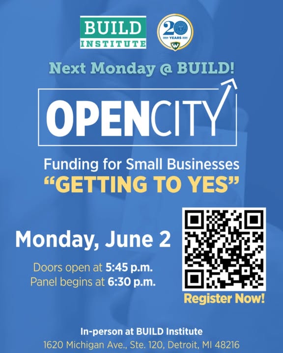 💰 Next MONDAY @ BUILD 💰 BUILD Institute and TechTown are reviving Open City workshops 🙌🏼 RSVP for our first event on June 2nd Are you struggling to secure funding for your business — or not even sure where to start? You're not alone. Many entrepreneurs are left in the dark about how to prepare for a lender meeting, what funders are really looking for and how to choose the right financing option. But what if the difference between a "no" and a "yes" is simply being better prepared? Join us on Monday, June 2 for Open City: “Getting to Yes,” hosted by BUILD Institute and TechTown Detroit. Open City is a new series of workshops brought to the community by BUILD and TechTown! Moderated by April Anderson of Good Cakes and Bakes, this powerful panel brings together small business owners, investors and lenders to share the inside scoop on how to: 💡 Get capital-ready before your first meeting 🔍 Understand what really matters to funders 📊 Match your needs with the right financing source 🚫 Avoid common mistakes that kill deals ✨ Panelists include: Arlena Minter of Michigan Women Forward, Brittni Abiolu of VentureHue, Liz Blondy of Canine to Five and Onni Stone of BUILD Institute. Whether you’ve applied for funding before or are just starting the process, this conversation will give you the tools and insight you need to move forward with confidence. RSVP Now: https://startupspace.app/v2/dynamic-survey/view/210/2464 (fb)
