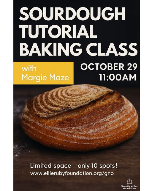 Join us for a hands-on sourdough class with Margie Maze — a passionate home baker who has spent years perfecting the art of slow-fermentation breads. Margie is known for her approachable teaching style and loves helping others gain confidence in their own kitchens. Tuesday, October 29 at 11:00AM Location: Address will be provided upon registration Limited spots available – only 10 seats! Register now at 👉 www.ellierubyfoundation.org/gno Link in bio (fb)