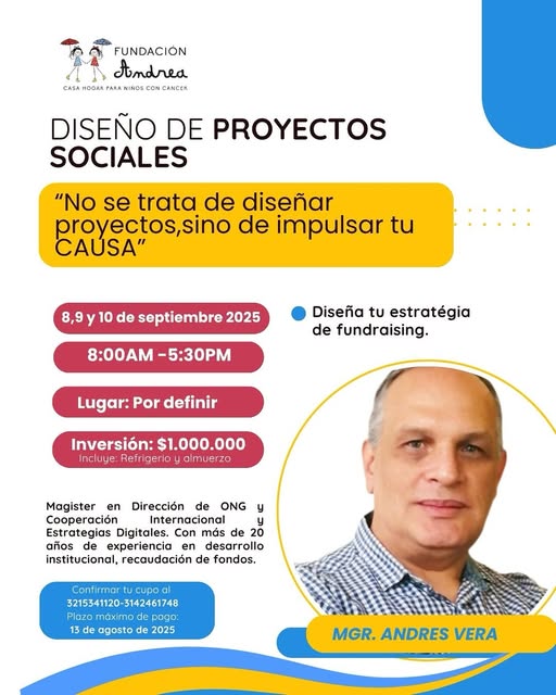 🌍 En Casa Hogar Andrea creemos en el poder del conocimiento para transformar realidades. Por eso, tendremos un taller exclusivo con Andrés Vera, experto internacional en sostenibilidad y desarrollo de ONGs. 📣 ¿Trabajas en una organización social? Este espacio también puede ser para ti. Escríbenos para más información. 📲3215341120 - 3142461748 #CasaHogarAndrea #ONGs #ProyectosSociales #Sostenibilidad #Niñez #TeoríaDelCambio (fb)