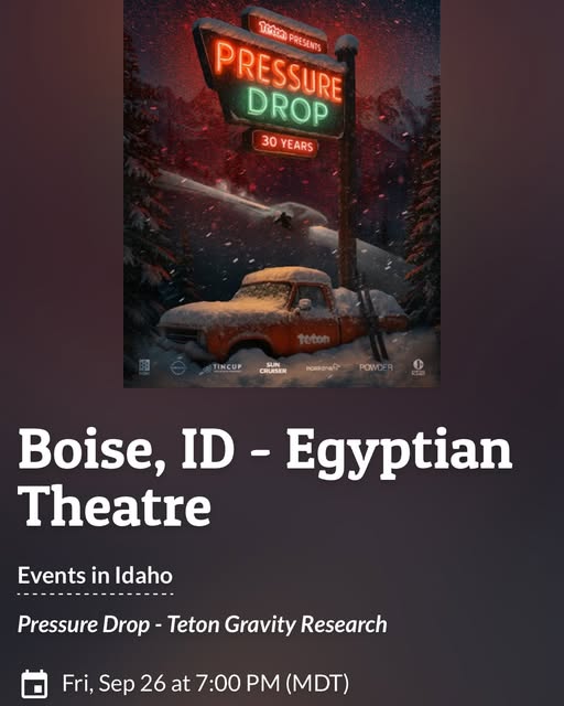 Come join BASE at the Egyptian Theater for Teton Gravity Research’s “Pressure Drop." Pressure Drop features the world’s best skiers and snowboarders (plus the next generation) as they chase deep powder, massive cliffs, stacked pillow lines, and iconic spines from Alaska to Norway, BC to California, and home in Jackson Hole. This film captures that fleeting moment between calm and chaos. The instant before gravity takes over! You don’t want to miss it. It’s going to be an incredible night as we eagerly await the season! 🎿🏂 📍 Egyptian Theater 🕕 Doors: 6:00 PM 🎟️ Raffle + Pre-show: 7:00 PM #AdaptiveSports #AdaptiveAthletes #NoLimits #SkiLife #SnowboardingLife #PowderDay #SendIt #SkiBoise #SnowboardBoise #MountainLife #WinterStoke #BoiseEvents #ThisIsBoise #IdahoAdventure #BoiseStrong #TreasureValley (fb)