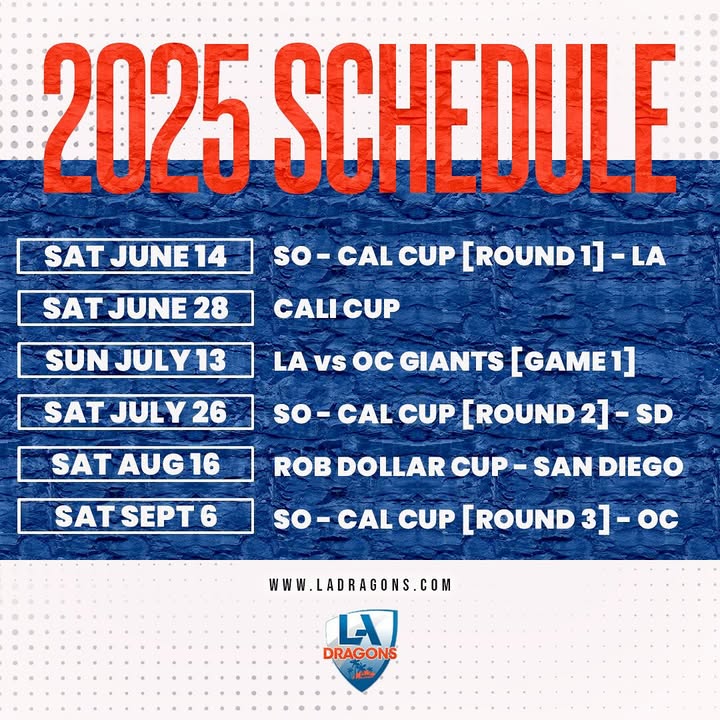 Our 18 a side regular season schedule has been finalized! There are 3 more chances to catch your friendly neighborhood dragons playing in Los Angeles: Sunday June 1st - Metro Round 4 @ Penmar Park Sunday June 8th - Metro Championship @ Penmar Park Saturday June 14th - SoCal Cup Round 1 @ Westchester Park See you there! 🐉🔥 (fb)