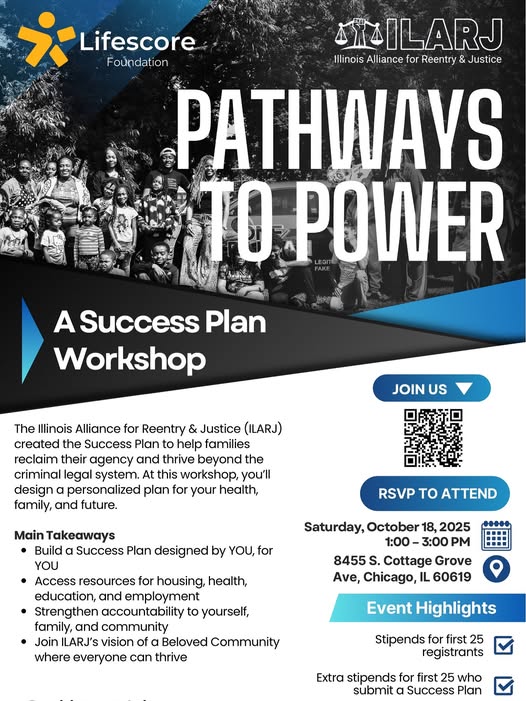 Pathways to Power: A Success Plan Workshop 💪 Design a plan for your health, family, and future—then put it into action. 📅 Sat, Oct 18, 2025 | 1–3 PM 📍 8455 S. Cottage Grove Ave, Chicago ✅ Stipends for first 25 registrants ✅ Extra stipends for first 25 who submit a Success Plan 🥗 Lunch provided 🔗 RSVP: scan the QR on the flyer #LifescoreFoundation #ILARJ #PathwaysToPower #BelovedCommunity #ChicagoEvents #Reentry #Justice #CommunityHealing (fb)
