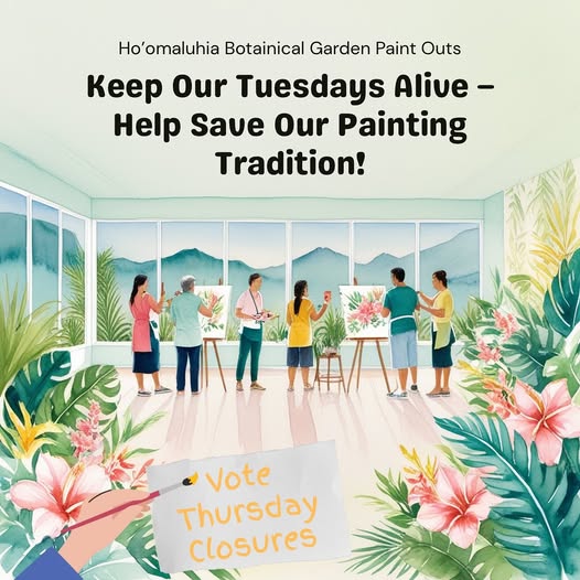 🌿🎨 Aloha HWS ʻOhana! For years, our artists have gathered at Hoʻomaluhia Gardens every Tuesday to paint, connect & share aloha. 💕 In 2026, the gardens will close one day a week (Tues or Thurs). While we support this change, the press release mistakenly said there’s no activity on those days. ✨ Please help us keep our Tuesday painting tradition alive by voting for Thursday as the closure day! 🗳️ Deadline: Oct 8, 2025 Link in bio to vote! Or this link https://bit.ly/HoomaluhiaSurvey Mahalo for your support! 🌺 (fb)