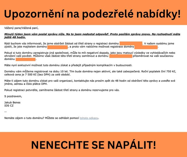⚠️POZOR NA ZAVÁDĚJÍCÍ NABÍDKY NA REGISTRACI DOMÉN⚠️ Vážení klienti a sledující, v poslední době jsme zaznamenali, že se objevují e-maily s nabídkou na registraci domén podobných těm vašim. Tyto e-maily pochází od neznámých poskytovatelů a mohou působit velmi důvěryhodně – jedná se však o zavádějící praktiky, které vás mohou zbytečně připravit o peníze. ❗️Na co si dát pozor: Jedná se o taktiku zvanou „domain slamming“, která vás má přimět k tomu, abyste si doménu zaregistrovali za vysoký poplatek s domněním, že vás někdo jiný ohrožuje. Ve skutečnosti tyto nabídky většinou nepotřebujete, protože vaše doména je již chráněna. ❗️Co dělat, pokud takový e-mail obdržíte: 1️⃣Ignorujte nabídky od anonymních nebo neznámých poskytovatelů. 2️⃣Pokud máte pochybnosti, kontaktujte nás – rádi vám poradíme. 3️⃣Nikdy neplaťte za služby, které si nejste jistí, že opravdu potřebujete. Jsme tu pro vás a rádi vám pomůžeme ochránit vaše stránky před nekalými praktikami. Pokud obdržíte podobný e-mail a nevíte, co s ním, napište nám e-mail na podpora@estranky.cz! 📩 (fb)