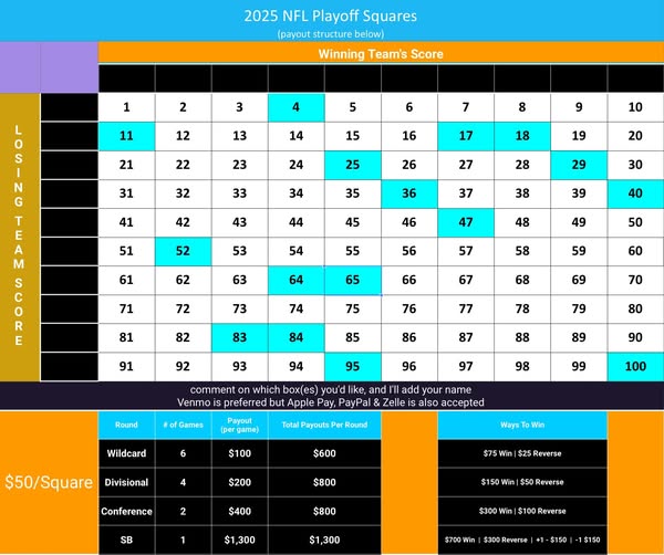 It’s square time!!! Donate $50 to secure your NFl Playoff square. 28 chances to win. $700 grand prize. All proceeds go to #Village606. (Green Squares are already taken) We accept Venmo, PayPal (add $Village606essing fees), Apple Pay & Zelle. Money due Friday, Jan 10th. Link to donate here: https://linktr.ee/Village606 Zelle/Apple Pay: DM Jé Tania (fb)