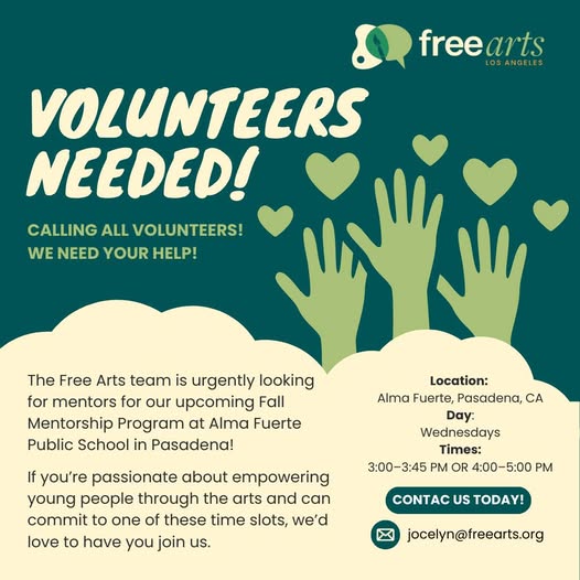 🚨 Volunteer Opportunity Alert 🚨 The Free Arts team is urgently looking for mentors for our upcoming Fall Mentorship Program at Alma Fuerte Public School in Pasadena! 🌟 📍 Location: Alma Fuerte Public School, Pasadena, CA 🗓 Day: Wednesdays ⏰ Times: 3:00–3:45 PM OR 4:00–5:00 PM If you’re passionate about empowering young people through the arts and can commit to one of these time slots, we’d love to have you join us. 💙 👉 Contact Us Today: jocelyn@freearts.org #FreeArtsLA #VolunteerOpportunity #MentorshipMatters #PasadenaVolunteers #FallMentorship (fb)