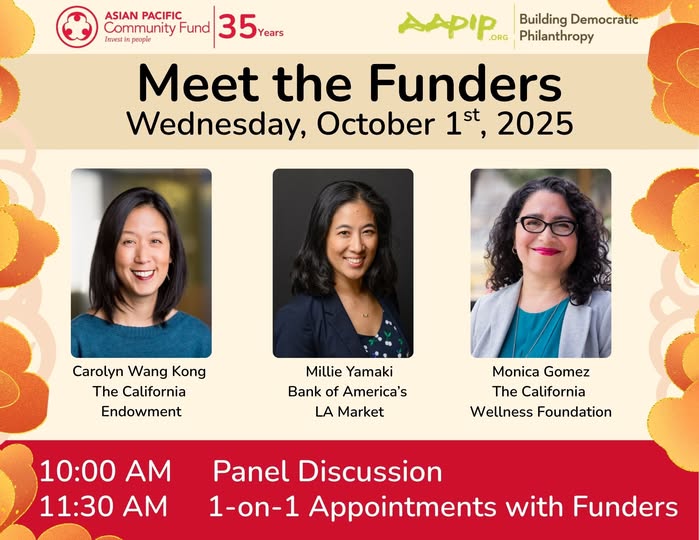 We’re excited to announce Meet the Funders, a special collaboration between APCF and AAPIP-LA. ✨ What to expect: 💡 Insights on funding priorities & eligibility 💡 Tips for successful applications 💡 One-on-one sessions with funders to ask YOUR questions & receive personalized feedback 📅 Don’t miss this chance to expand your network and strengthen your nonprofit’s funding potential! Register now: https://apcf2.tfaforms.net/f/mtff25 One-on-One Sessions (deadline Sept. 19, 5PM PST) Panel (deadline Sept. 29, 5PM PST) (fb)