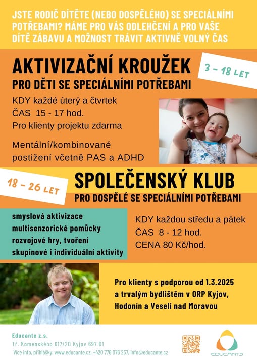 🟠Aktivně strávený volný čas, zábava a noví kamarádi! ❓Hledáte přesně tohle pro své dítě (nebo dospělého) se speciálními potřebami? 🧡Právě jste našli! V Educante nově nabízíme ✨AKTIVIZAČNÍ KROUŽEK✨ pro děti se speciálními potřebami a ✨SPOLEČENSKÝ KLUB✨ pro dospělé se speciálními potřebami. Dětem zajistíme nabitý program a vám, rodičům, na chvíli odlehčíme. 🫶 Začínáme už 15. dubna! Registrace je možná zde: https://educante.cz/sluzby/aktivizacni-programy/#spolecensky-klub (fb)