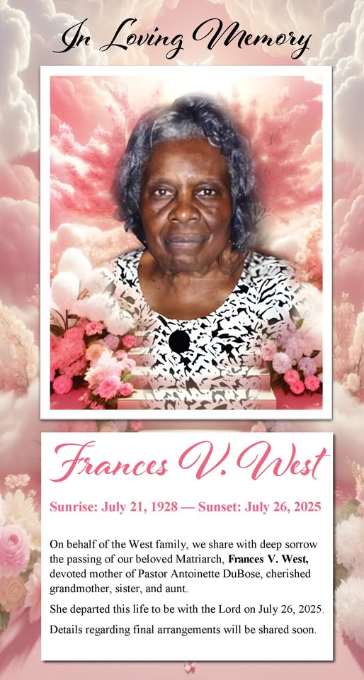 ** IMPORTANT UPDATE: ** Please see the revision to Mrs. West's Arrangements below. The time and location for the Family & Friend's REPAST have been updated. Thank You! (fb)