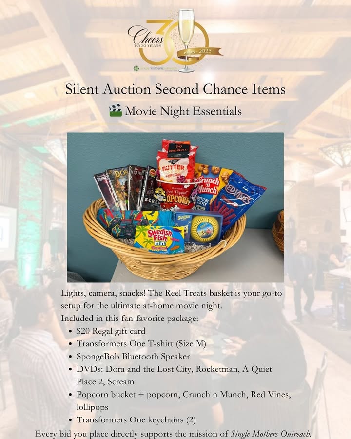 ✨ Self-care or movie night? Why not both? Two new items just hit the Second Chance Silent Auction and they’re made for treating yourself — mind, body, and soul: 🧘♀️ Pilates Package for Perfection – Group class, wellness journal, cozy gear, and even a dress to inspire confidence. 🎬 Reel Treats: Movie Night Essentials – Gift card, DVDs, snacks, and speaker magic for a next-level movie night. onecau.se/cheersto30years Bid now and support single-parent families in Santa Clarita 💛 Tap the auction tab to explore more! #SMO30Years #SecondChanceAuction #SupportSingleMoms #SilentAuction #WellnessVibes #MovieNight #BidForGood #SantaClaritaStyle (fb)