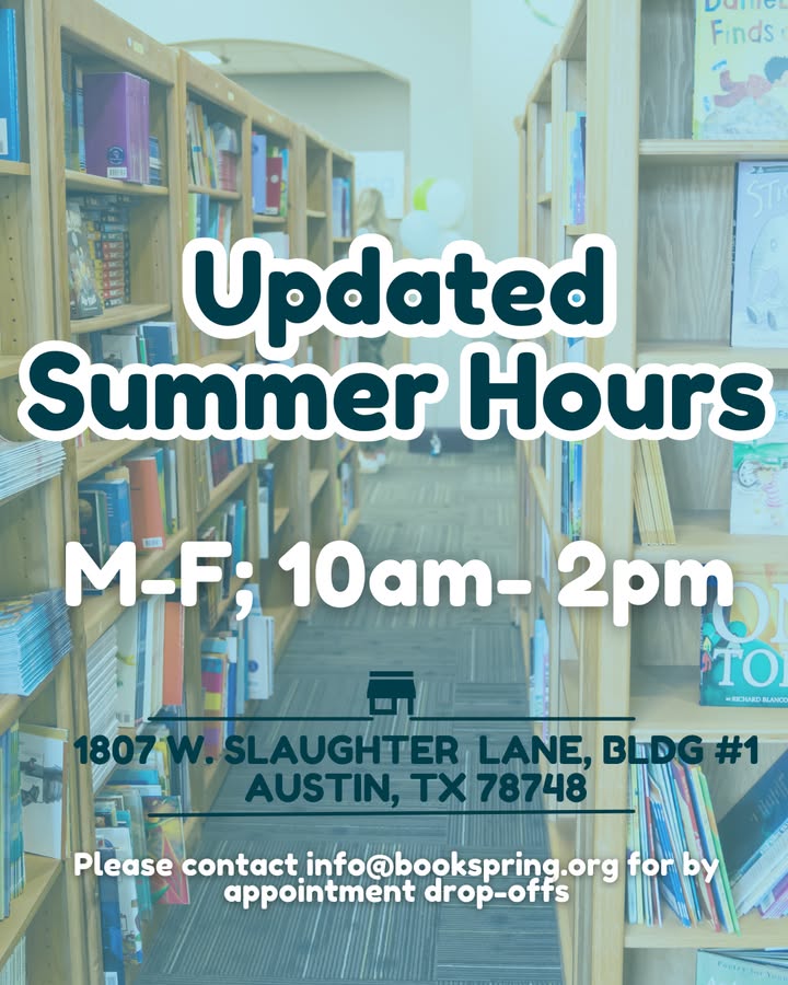 As we approach the summer season, please note our adjusted office hours starting June 1st. For any large book drop-offs outside these hours, kindly email us at info@bookspring.org or use the donation bin located outside our headquarters! Stay cool and keep reading! (fb)