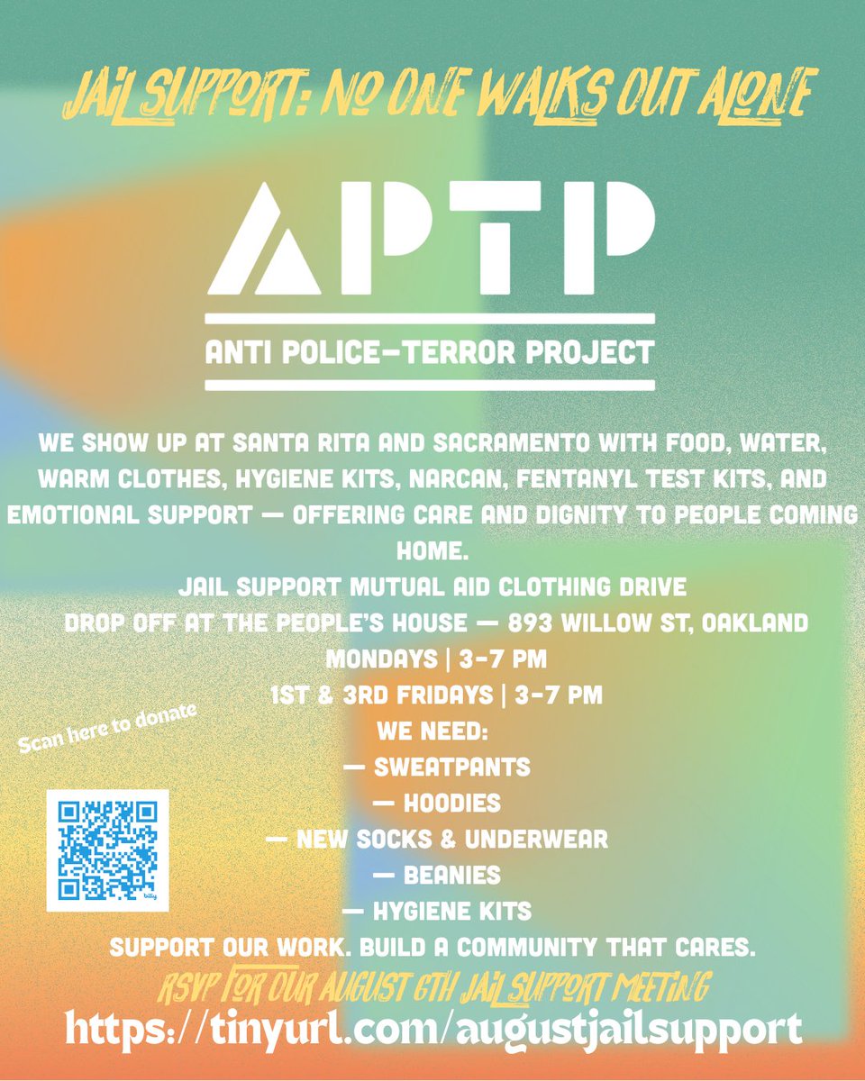 JAIL SUPPORT IS COMMUNITY CARE Join us Wed, Aug 6 @ 6:30PM for our monthly Jail Support meeting RSVP: https://t.co/p6alTyToH6 We greet our people coming out of jail w/ warmth, food, hygiene kits & love. No one walks out alone. 🧦 Donate gear or $: https://t.co/cKxKp8p2xl https://t.co/GIz0ba1DgV (tw)