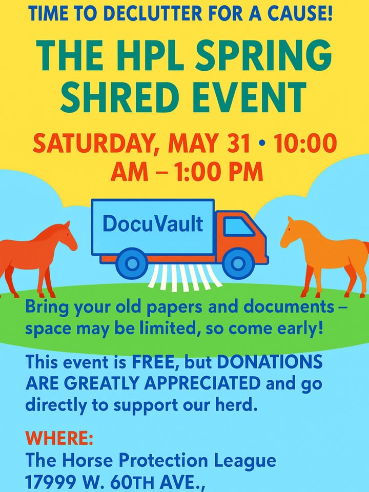 Time to declutter for a cause! Get a jump on spring cleaning at The HPL Spring Shred Event on Saturday, May 31 from 10:00 AM – 1:00 PM. We’re teaming up with DocuVault for on-site shredding right here at the ranch! Bring your old papers and documents — space may be limited, so come early! This event is free, but donations are greatly appreciated and go directly to support our herd. Where: The Horse Protection League 17999 W. 60th Ave., Arvada, CO 80403 (fb)
