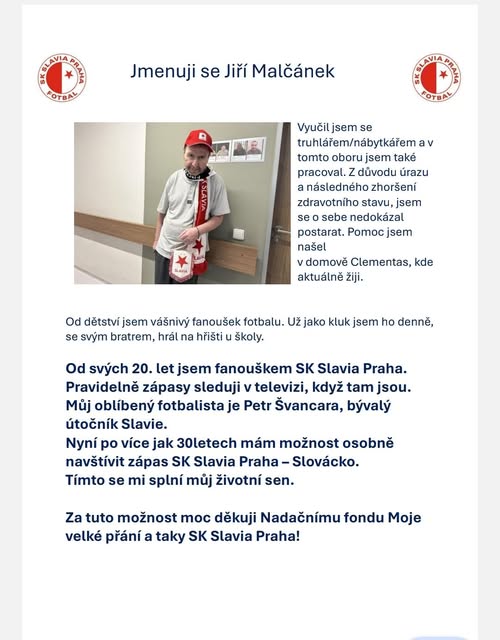 A další fotbalové přání :-) Pan Milan (70 let) jako mladý hrával fotbal za Bílou Horu. Celé dětství jezdíval za svojí babičkou do Teplic a fotbalovému teplickému klubu fandí celý svůj život. Pracoval jako řidič. Bohužel po rozpadu manželství přišel o bydlení a odstěhoval se tak do maringotky, kde mu však omrzly nohy a záhy o ně přišel. Pohybuje se tedy na invalidním vozíku a žije v domově se zvláštním režimem v Praze. Odtud nám napsali, že pan Milan je moc hodný člověk, který si splnění přání zaslouží. Díky panu Davidovi, který je jeho pečovatelem, dvěma dobrovolníkům z našeho NF a úžasnému přístupu fotbalového klubu Bohemians Praha 1905 můžeme přání splnit. Pan Milan bude mezi fanoušky Teplic a prostřednictvím fotografií vám zážitek zprostředkujeme. Držte palce až se 29. března setkání vydaří. (fb)