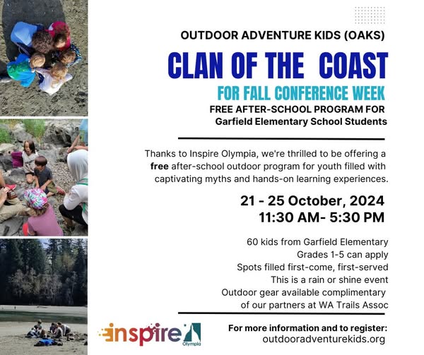UPDATE Oct 16, 2024: FALL CONFERENCE WEEK CANCELLED Due to complications with inter-agency requirements, we regret to inform you that we will not be able to offer the program at this time. As this is the first offering of its kind, we believe that the work we’ve done will help ensure a smooth experience when we re-launch the program during Spring Conference Week. Everyone who registered for the fall program will have first priority for spaces in the spring. We sincerely apologize for any inconvenience this may cause and look forward to our experience together in March. ** FREE OAKS OUTDOOR PROGRAM FOR GARFIELD STUDENTS DURING FALL CONFERENCE WEEK (OCT 21 - 25) ** Thanks to Inspire Olympia, we are thrilled to be offering Garfield Elementary Students in Olympia WA a free Conference Week after-school outdoor program, we have 60 spots to fill, please forward to your Garfield families! Registration is open, first come first served. (fb)