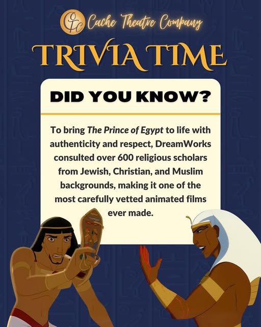 🤯 YOU WON’T BELIEVE THIS… For real though, buckle up for this TRIVIA TUESDAY drop: To bring “The Prince of Egypt” to the screen, DreamWorks didn’t just guess their way through the story and its symbolism. They brought in over 600 religious scholars (Jewish, Christian, Muslim, etc) to make sure every moment was told with care, depth, and authenticity. That’s not just storytelling... that’s epic-level dedication🙌🔥 And now, we’re bringing that same powerful story to life right here in Logan! Don’t miss your chance to see this powerful story live on stage with Cache Theatre Company! 🎭💙 🎟️ Get your tickets NOW at cachetheatre.com #PrinceOfEgypt #TriviaTuesday #CacheTheatreCompany #FunFact #MusicalTheatre #FromScreenToStage #LoganUtah #CacheValleyUtah #Dramaturgy (fb)