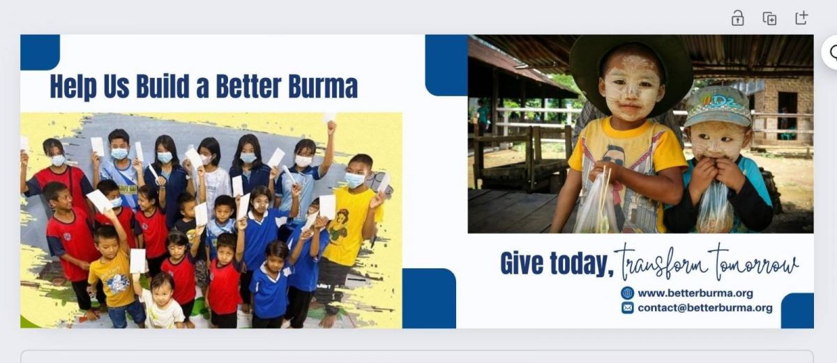 Help us build a Better Burma Myanmar is facing a severe humanitarian crisis with over 18 million people in need of urgent assistance and nearly a million displaced due to ongoing conflict and military action exacerbating the suffering of millions. With your help Better Burma is able to support the people of Myanmar through humanitarian aid and advocacy efforts. Please consider supporting our cause at Better Burma to bring hope and essential resources to people of Myanmar. Your generosity can change lives.
