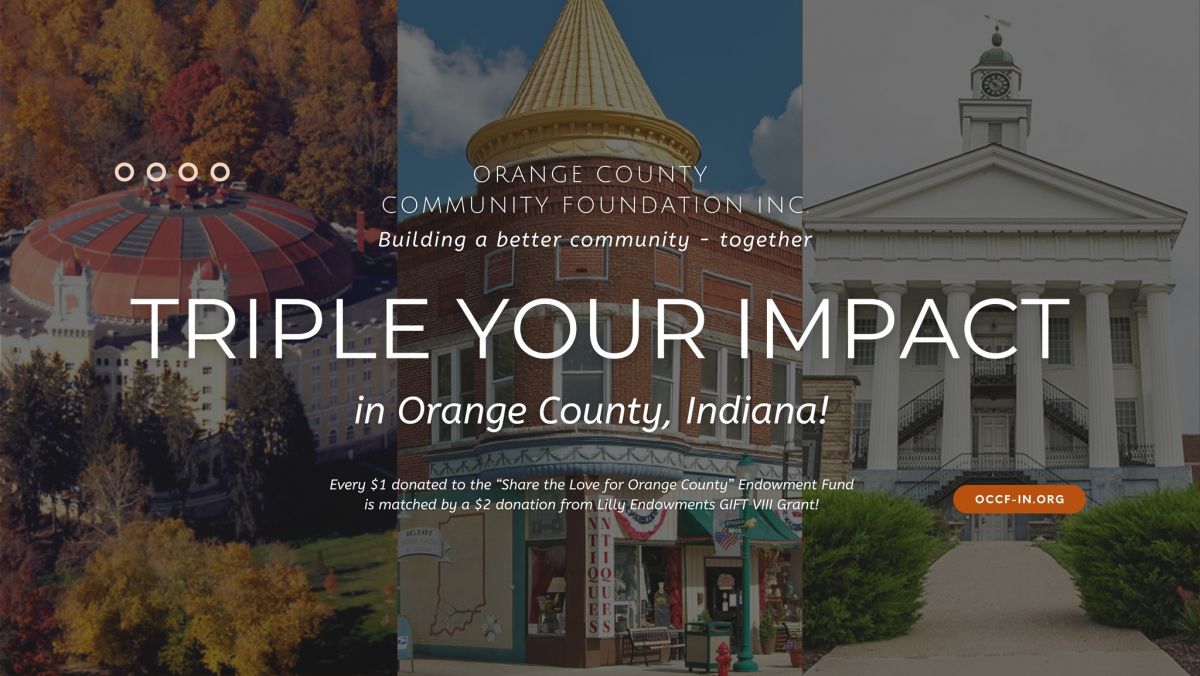 Triple Your Impact in Orange County Building a better community. together Through strategic grantmaking scholarships and community partnerships Orange County Community Foundation Inc. is helping build and grow charitable efforts throughout our community. Endowment funds created by local donors and charitable gifts from other foundations enable us to continue our efforts.
