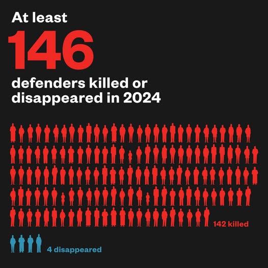 At least 146 land and environmental defenders were killed or disappeared around the world last year defending their land, communities or the environment. Read the full report - https://gwitness.org/4pppmHy #StandWithDefenders (fb)