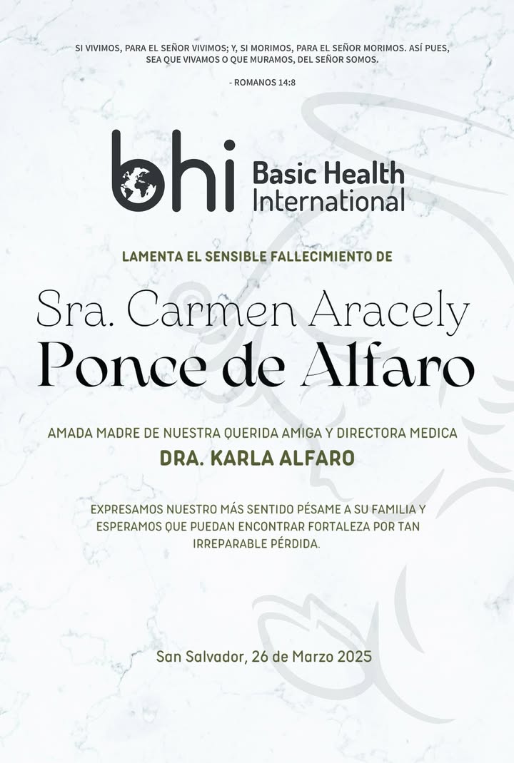 Lamentamos profundamente el sensible fallecimiento de la Sra. Carmen Ponce de Alfaro, madre de nuestra directora médica, Dra. Karla Alfaro. Nos unimos en solidaridad y oración con la familia, deseando que encuentren paz y fortaleza. (fb)