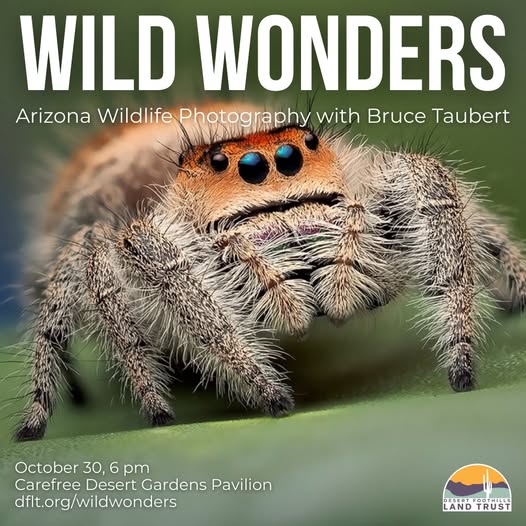 Get ready for an incredible evening with DFLT and Bruce Taubert - photographer extraordinaire and retired wildlife biologist! His dual expertise creates images that reveal both the beauty AND the science behind Arizona's remarkable wildlife. From the tiniest desert creatures to our most majestic mammals - discover the wild wonders living right in our backyard! Details: Thursday, October 30th, 6 pm Carefree Desert Gardens Pavilion Tickets: $25 at dflt.org/wildwonders (fb)