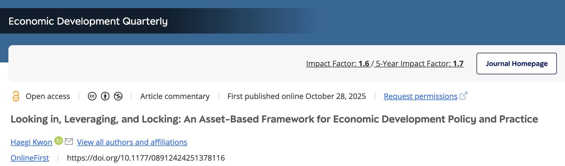 What would economic development look like if resident well-being and equity were primary goals, not aspirational after-effects of growth? In a new Economic Development Quarterly article, Associate Director for Equity and Opportunity Haegi Kwon presents a framework to do exactly that. Haegi's model, Looking in, Leveraging, and Locking (3Ls), synthesizes existing asset-based theories to explore how economic development practice may be more attuned to promoting equitable development in places, particularly those with histories of disinvestment, population loss, and other challenges. Read her article, which is based on research supported by RWJFoundation: https://journals.sagepub.com/doi/10.1177/08912424251378116 (fb)