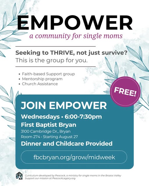 BCS Families - Feeling the pinch of back-to-school clothes and supplies, of traffic, groceries & gas and utilities as temperatures rise and 90,000 student return?! Imagine the pressure of all this as a single mom! "EMPOWER" allows single moms to take a breath, have a meal and childcare while they fellowship with other single moms and a specialized bible study to remind them THEY are beloved children of God! First Baptist Bryan is paving the way for other local churches to be active missionaries to empower the single-mom families of BCS! Spread the word - we'd love to welcome as many single-moms as will come! THIS WEDNESDAY 8/27 6PM (fb)