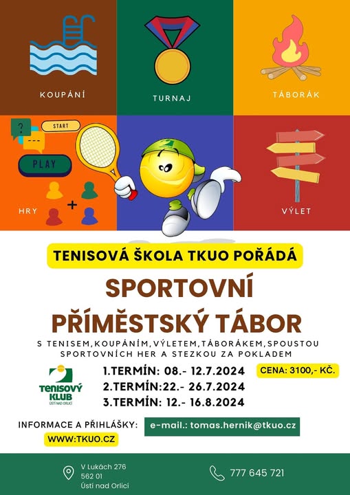 PROGRAM TENISOVÉHO KEMPU TŠ TK ÚSTÍ NAD ORLICÍ pondělí 8.-11. 30 hod rozcvička, tenisový trénink 13.00-15.30 hod tenisový trénink, sportovní hry úterý 8.-11.30 hod rozcvička, tenisový trénink 13.00-15.30 hod tenisový trénink, sportovní hry středa 8.-11.30 hod rozcvička, tenisový trénink 13.00-15.30 hod výlet na kolech, sportovní hry čtvrtek 8.-11.30 hod rozcvička, pětiboj (atletika/tenis) 13.00-15.30 hod aquapark pátek 8.-11.30 hod rozcvička, sportovní hry 13.00-15.30 hod hledání pokladu, zakončení a předání cen (fb)