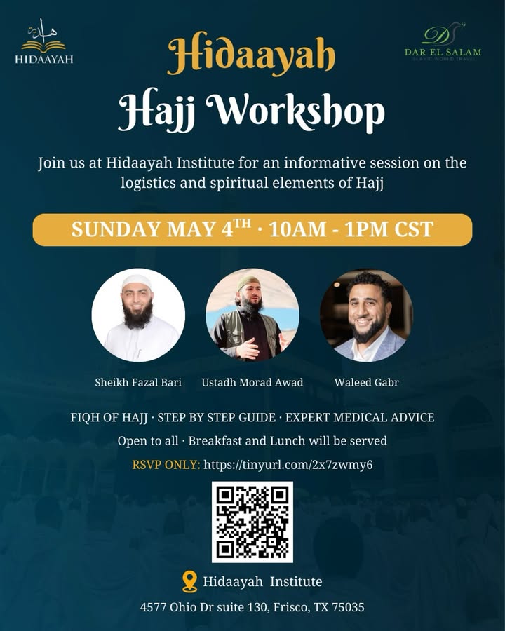 As Salaam Wa Alaikum! Join Sheikh Fazal Bari and guest speakers Ustadh Morad Awad and Waleed Gabr for an informative session on the logistics and spiritual elements of Hajj. 🗓️ Date: Sunday, May 4th ⏰ Time: 10:00 AM - 1:00 PM CST 📍 Location: Hidaayah Institute, 4577 Ohio Dr Suite 130, Frisco, TX 75035 The workshop will cover: Fiqh of Hajj Step-by-step guide Expert medical advice It’s open to all, and breakfast and lunch will be served! 😋 RSVP is required: https://tinyurl.com/2x7zwmy6 Don’t miss this valuable opportunity to prepare for Hajj. Feel free to share this with anyone who might be interested! Jazakum Allahu Khairan. 🙏 (fb)