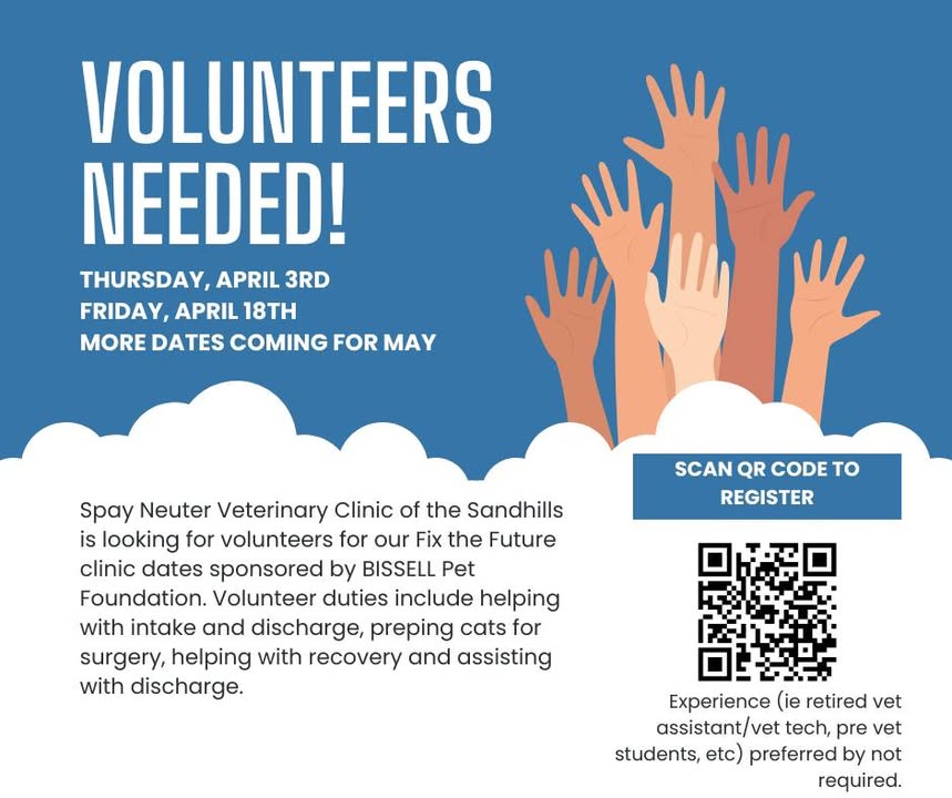 We have two #FixTheFuture clinics this week-- the Wednesday and Thursday, the 28th and 29th. We still have open volunteer shifts. Volunteers assist with vital tasks including helping with intake and discharge, cleaning instruments and preparing cats for surgery. Without volunteers, we cannot hold these clinics and risk having to cancel this life-saving program. If you'd like to volunteer, please fill out an application at https://form.jotform.com/243564108668161?fbclid=IwY2xjawKJiKFleHRuA2FlbQIxMABicmlkETFOZ1RIMkp5a2ttVXNrMmV0AR6SPrkfF8pzwyHG9VEl_jBZETEOai5MNo2WbDF6owh8FKWpJg2e9_TQ7EeMuQ_aem_jTZaeOHypkssey9rKKAlUw The clinics are held at 309 W. Duncan St. in Lillington. Ideally volunteer should be able to commit to either 6:45 to noon or from noon to 5 PM (fb)