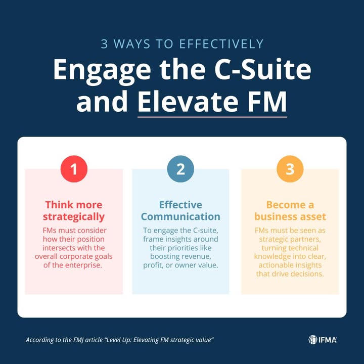C-suite leaders are under pressure to make bold decisions in an increasingly unpredictable world. For facility managers, understanding these challenges is key to offering strategic value. This article explores how FMs can better engage with executives by thinking more strategically, communicating effectively and becoming true business assets. 👉 Learn how: https://fmj.ifma.org/level-up?utm_campaign=level+up&utm_source=facebook&utm_medium=social&utm_content=1748009580 (fb)