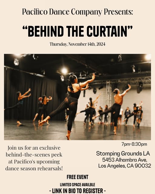 Pacifico Dance Company Presents: “Behind the Curtain” November 14th, 2024 🎬✨ Link in Bio to Register for this FREE Event! Hurry! Limited space available! DM us for any additional questions/ info ✨ (fb)