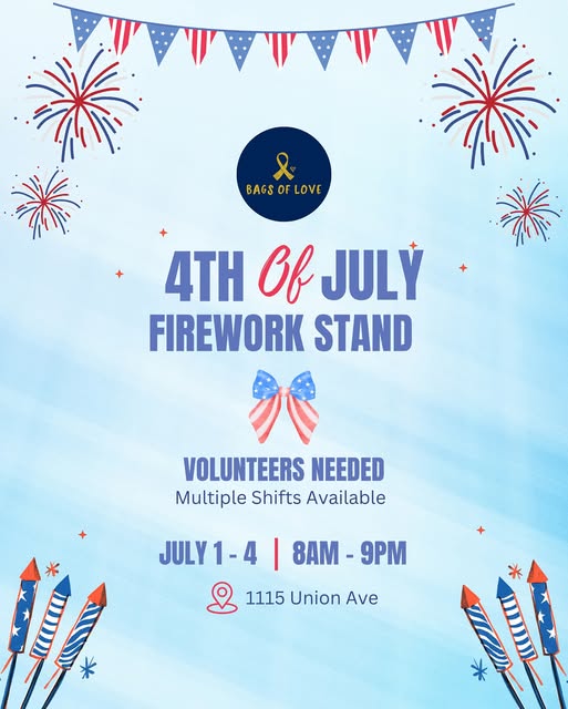 🎇 VOLUNTEERS NEEDED! 🎇 We’re looking for helping hands to support our TNT Fireworks Stand from July 1–4 in Bakersfield! Every shift helps raise funds for kids and young adults fighting cancer. 💛 Bring a friend, earn community service hours, and make a difference this 4th of July. 👉 Sign up now — link in bio or DM us! #BagsOfLoveFoundation #GoGold #VolunteerForACause #FourthOfJulyWithPurpose (fb)