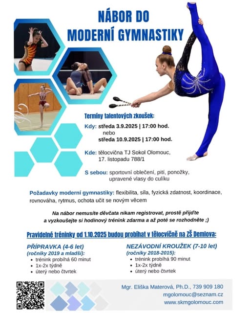 💙 Nábor do moderní gymnastiky v Olomouci! Hledáme šikovné holčičky od 4 let, které milují pohyb, tanec a ladnost 🤸♀️ Přijďte si zdarma vyzkoušet trénink a zjistěte, jestli je gymnastika to pravé právě pro vás! 💪 📅 Talentové zkoušky: 3. 9. nebo 10. 9. od 17:00 📍 TJ Sokol Olomouc (fb)