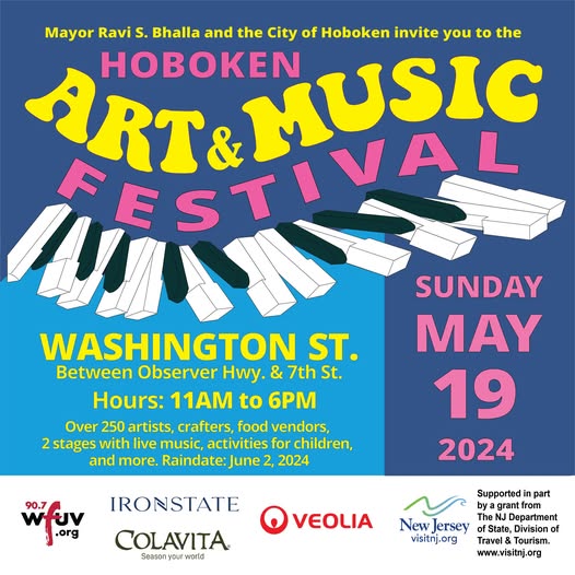 The Hoboken Arts and Music Festival returns on Sunday, May 19, 2024, on Washington St. from Observer Highway to 7th St., 11am to 6pm. For more information and band performance schedule: https://www.hobokennj.gov/events/hoboken-spring-arts-and-music-festival-2024 (fb)